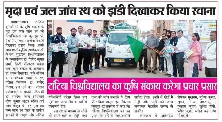 टांटिया विश्वविद्यालय श्री गंगानगर के कृषि संकाय की मृदा एवं जल परीक्षण प्रयोगशाला के मृदा एवं जल जांच रथ को मिली हरी झंडी